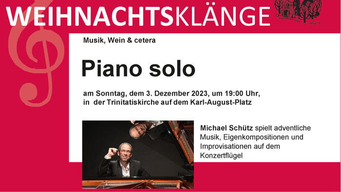 Michael Schütz entführt die Zuhörer in die Welt der Pop-, Jazz- und Rockmusik, bekannte Advents- und Weihnachtslieder umspielt er mit Eigenkompositionen und Improvisationen auf dem Konzertflügel