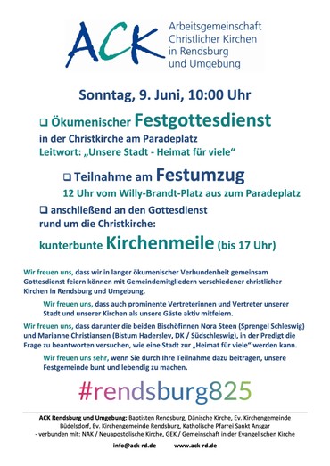 Herzliche Einladung anlässlich des Stadtjubiläums 825 Jahre Rendsburg zum Ökumenischen Festgottesdienst und zum Kindergottesdienst am Sonntag, 9. Juni um 10 Uhr in der Christkirche. Leitwort des Festgottesdienstes: „Unsere Stadt - Heimat für viele“
