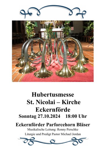 Die Kirchengemeinden Borby und St. Nicolai und die Kreisjägerschaft Eckernförde laden zur Hubertusmesse ein. Sie wird musikalisch von dem Parforcehornbläserkreis Eckernförde unter der Leitung von Ronny Perschke gestaltet. Die Liturgie und Predigt wird Pastor Michael Jordan halten.