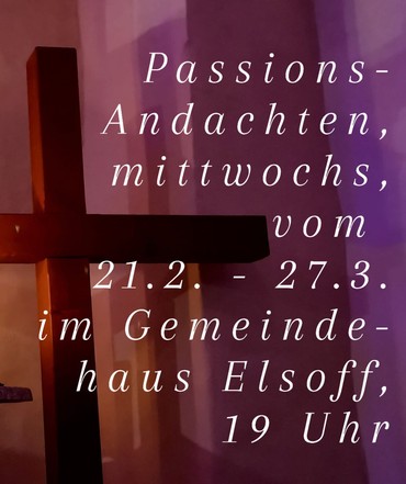 Die Andachten finden immer mittwochs im Gemeindehaus Elsoff statt. Beginnend am 21. und 28. Februar sowie am 06., 13., 20. und 27. März in der Zeit von 19.00 bis ca. 19.40 Uhr.