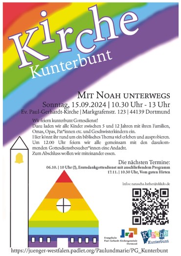 Pfarrerin Niehus und das KiKuBu-Team feiern mit Ihnen die Kirche Kunterbunt, ab 10.30 Uhr mit Aktionen für Kinder und Familien.
