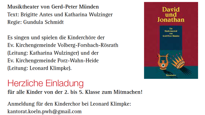 Die Kinderchöre der Ev. Gemeinde Volberg-Forsbach-Rösrath und Köln-Porz-Wahn-Heide spielen und singen in einer Aufführung am Sonntag, 26. Mai 2024 um 17 Uhr in der evangelischen Martin-Luther-Kirche, Köln-Porz-Wahn-Heide das Musiktheater DAVID und JONATHAN von Gerd-Peter Münden.