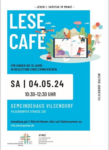 Das Lesecafé ist ein Kooperationsangebot der Kirchengemeinde und VINZ für Kinder bis 10 Jahre in Begleitung eines Erwachsenen und soll jeweils am ersten Samstag im Monat von 10:30 Uhr bis 12:30 Uhr im Gemeindehaus stattfinden.