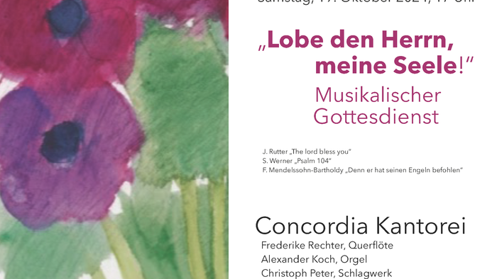 Am Samstag, d. 19. Oktober gestaltet die Concordia-Kantorei einen abendlichen Gottesdienst in der Annenkirche. Gemeinsam mit Instrumentalisten bringt der Chor u.a. Werke von Rutter, Mendelssohn, Durufle und Lieder aus Taizé zu Gehör und nimmt auch die Gemeinde mit in den gemeinsamen Gesang hinein. Die musikalische Leitung hat Kantorin Anna Fuchs-Mertens. Beginn ist um 17 Uhr.
