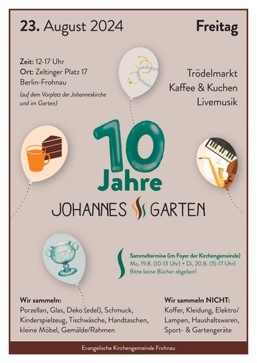 am Freitag, den 23. August 2024, von 12-17 Uhr mit einem Trödelmarkt auf dem Vorplatz der Johanneskirche Frohnau, Zeltinger Platz 17, mit Livemusik, Kaffee und Kuchen und manch anderem mehr im Garten.