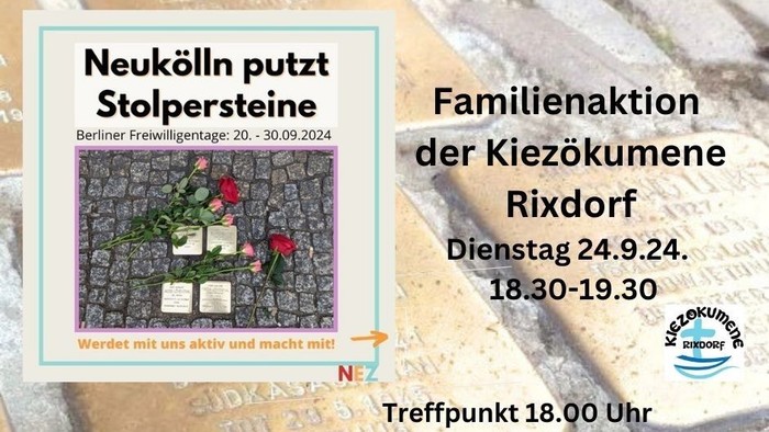 Wir machen mit und laden als Mitglied der Kiezökumene Rixdorf Menschen aller Generationen ein, am Dienstag 24.9.24. um 18.30-19.30 Stolpersteine zu putzen. Wir treffen uns um 18.00 Uhr im Gemeindehaus Magdalenen, Karl-Marx-Str. 197, 12055 Berlin zu einer kleinen Stärkung (Snacks und Getränke), Start soll um 18.30 sein, dann wollen wir für eine Stunde unterwegs sein. Voraussichtlich werden wir einige Steine in der Karl-Marx-Straße und in der Jonasstraße zuständig sein. Wer möchte, bleibt im Anschluss noch zu Austausch zusammen.