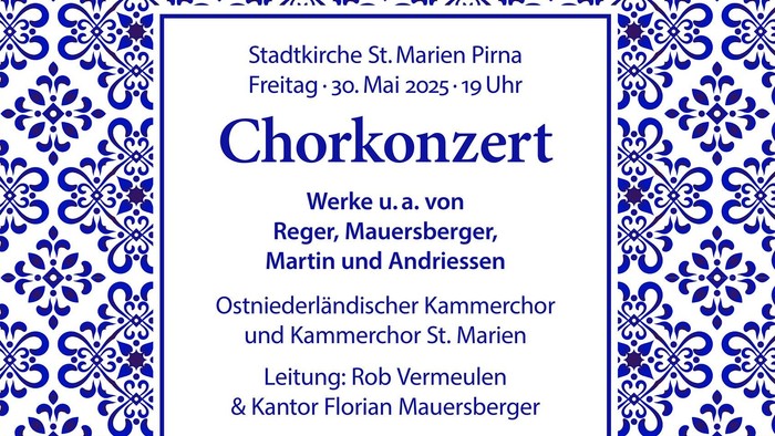 Freitag, 30. Mai 2025, 19:00 - 20:30 Uhr Stadtkirche St. Marien, Kirchplatz 14, 01796 Pirna Eintritt frei, Spende erbeten Ostniederländischer Kammerchor (Ltg.: Rob Vermeulen)